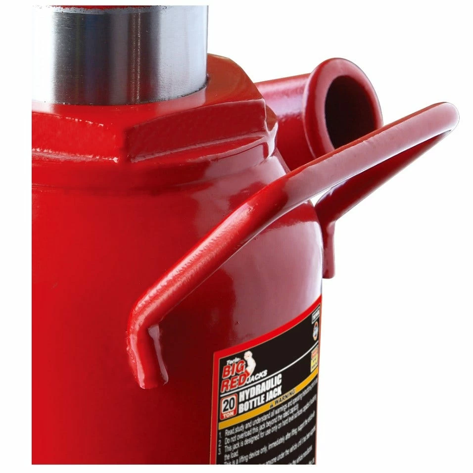 The BIG RED 20 Ton stubby low-profile hydraulic bottle jack is ideal for auto, truck service, farm, and garage use. It has a lifting range of 6-5/8″ to 10-15/16″ with a 20 ton (40,000 lb) capacity. This structure is designed for hard-hitting commercial use, making large loads easy to lift. The extension screw top design allows this bottle jack adjust to the desired work height easily and the Built-in oil-bypass and overload valve that protects the hydraulic system from extending beyond limits. Meets ASME PASE safety standards and includes a limited 1 year manufacturer warranty.