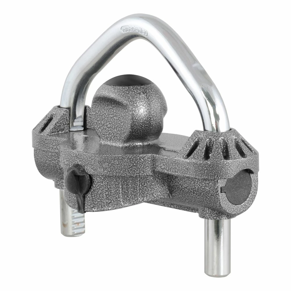Sometimes a safety pin and coupler latch are just not enough to keep your toys safe. While CURT safety pins and coupler latches are made to keep your coupler securely latched onto your trailer ball, they are no substitute for the locking power provided by a CURT trailer lock. CURT trailer locks are designed to add security to your trailer and towing equipment. Instead of merely retaining the coupler latch mechanism, CURT trailer coupler locks are actually designed to protect your trailer from theft when it is not hitched up to your vehicle. This trailer lock features diecast metal construction and a hammer tone epoxy finish for a lasting strength and resistance to the elements. The dual-ratcheting locking system easily secures your trailer by inserting into the coupler and taking the place of a trailer ball. This CURT trailer lock is key-operated and features a universal fit to accommodate a variety of couplers.