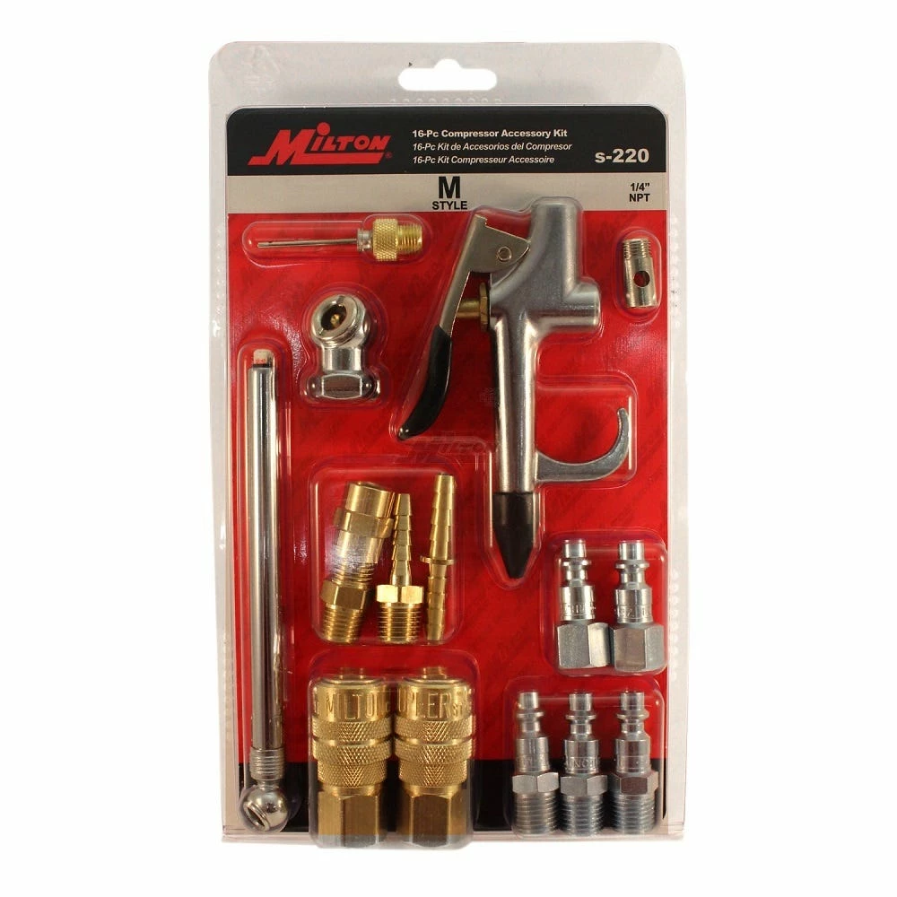 Milton’s 16 piece M-style compressor accessory kit is the perfect kit for a new compressor or just updating a current compressor. Kit includes a variety of 1/4″ couplers, plugs and a pencil gauges. Ideal for DIY projects, repair shop, mobile repair and maintenance.