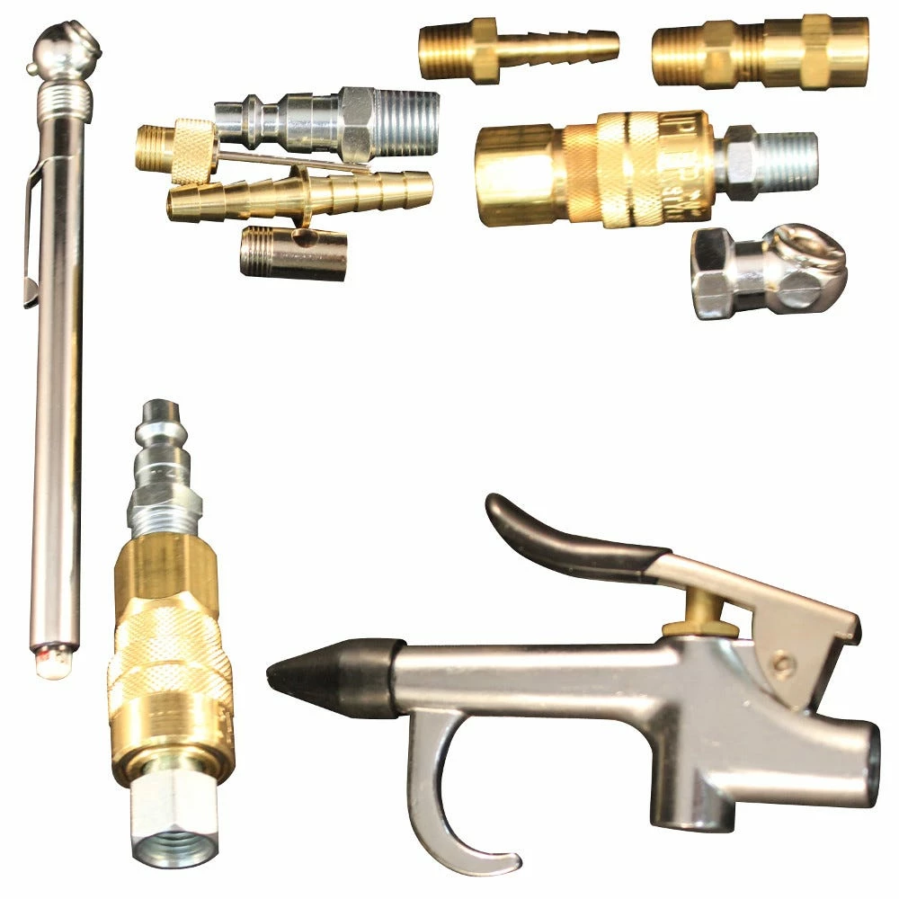 - Includes 1 male hose end, male hose mender, female hex coupler, male hex nipple, female air chuck, tire gage, Blo Gun adapter and Blo Gun inflator pin
