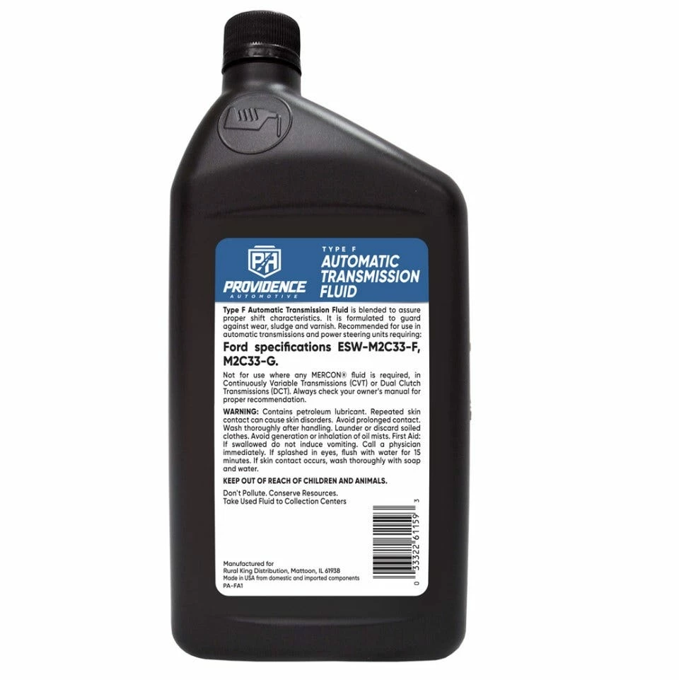 Providence Automotive Type F ATF meets the requirements of Ford specifications M2C33-F and M2C33-G and is recommended for use in all Ford passenger car automatic transmissions prior to the 1977 models as well as many 1977 through 1980 models. Please check the recommendation in the owner’s manual or transmission dipstick to determine the correct fluid, as misapplication may cause severe performance problems. It may also be used in power steering units or wherever a Type F fluid is recommended. Not for use where any MERCON® fluid is required.