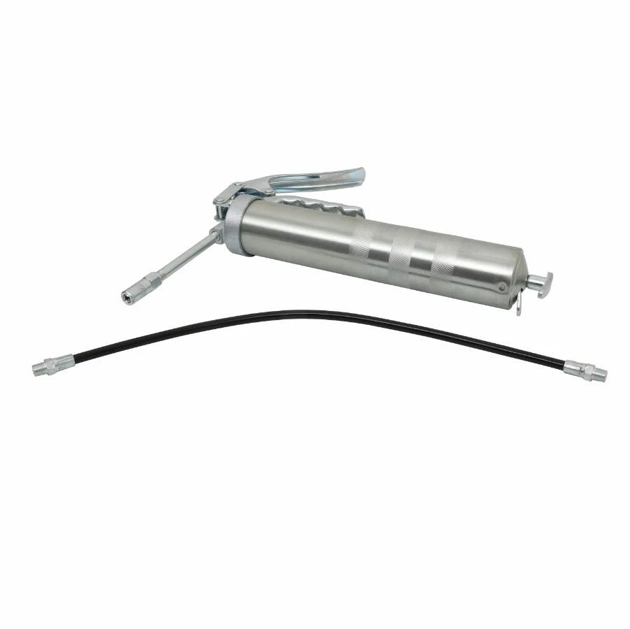 One hand operation for easy greasing. Comes with 18″ flex hose extension for hard-to-reach fittings. Develops up to 7,000 PSI. Handy 3-way loading: fill with standard cartridge, suction or bulk fill. Complete with 4″ extension pipe, four hardened jaws hydraulic coupler with ball check and non-drip cap.